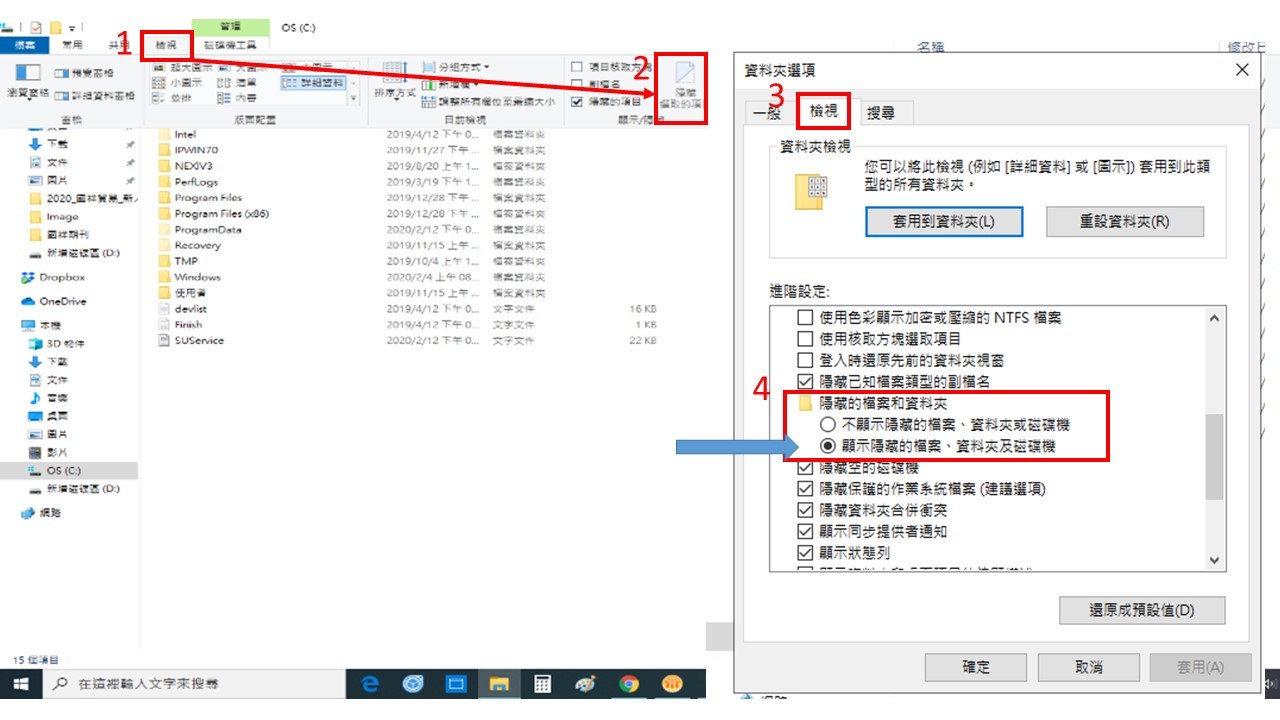 接著點選 [ 工具 ]=>選擇 [ 資料夾選項 ]=>接著在 [ 檢視 ]頁籤中可以看到 [ 隱藏檔案和資料夾 ]選擇 [ 顯示隱藏的檔案.